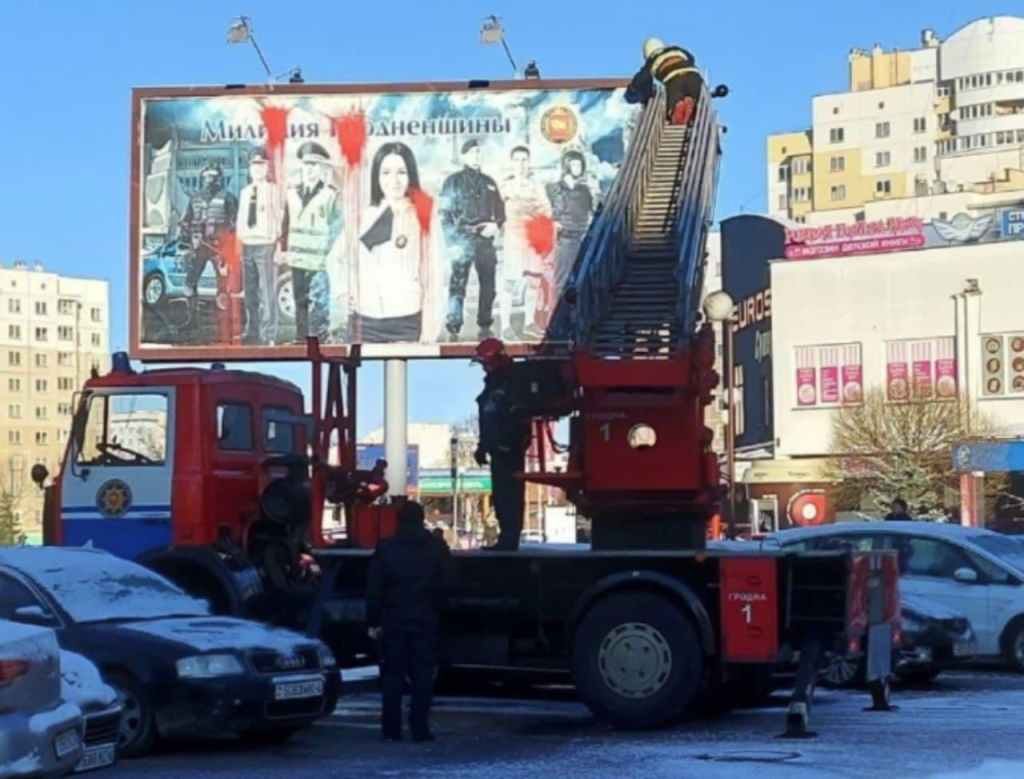 У ноч на 12 лютага ў Гародні невядомыя залілі чырвонай фарбай адзін з біг-бордаў, на якім выява “милиции Гродненщины”. Фота з’явілася ў некаторых тэлеграм-каналах.