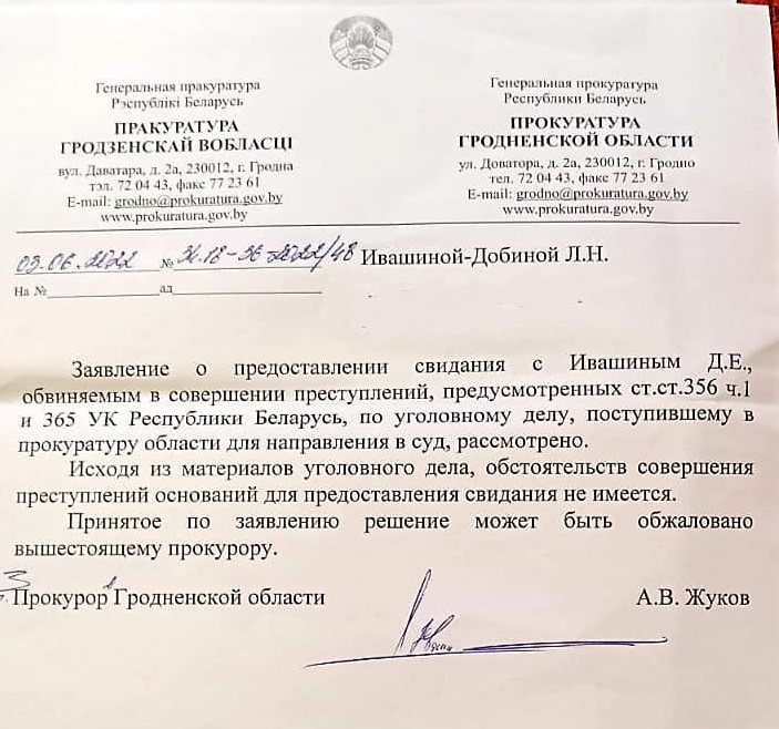 Маці гарадзенскага журналіста і палітвязня Дзяніса Івашына Людміла Івашына-Добіна пасля паведамлення пра завяршэнне следства ў справе супраць яе сына, звярнулася з афіцыйным запытам на спатканне з Дзянісам, які без малога 15 месяцаў перабывае ў СІЗА ПУ «Турма №1» Гародні. Супрацоўнік абласной пракуратуры Рабаў Уладзімір Віталевіч прыняў спачатку асабіста маці журналіста, а затым заяву ад яе на імя пракурора вобласці Жукава А.В.