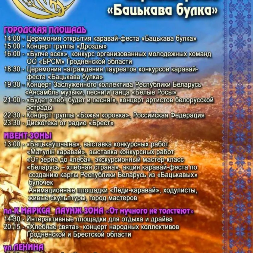 У раённым цэнтры Свіслач пройдзе першы ў Беларусі каравай-фэст «Бацькава булка». Ужо вядомая і праграма гэтага новага абласнога свята. На жаль, акрамя назвы і назваў пэўных конкурсаў, і праграма фэсту і прома-ролік да яго парыхтаваныя не па-беларуску, а па-расейску. Гэтая заганная практыка працягваецца па ўсёй Гарадзеншчыне. Нядаўна мы пісалі, што так праграма была падрыхтаваная і на Ашмяншчыне, дзе адбудзецца ўжо знакаміты фэст “Гальшанскі замак”.