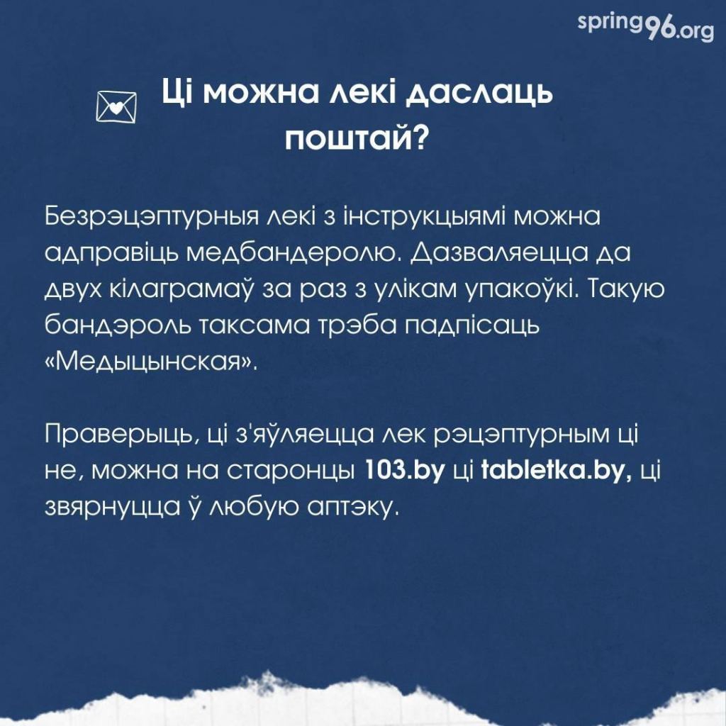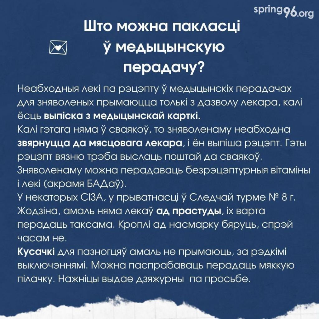 Спіс лекаў у месцах зняволення вельмі абмежаваны, таму вязні часам не атрымліваюць медыцынскую дапамагу своечасова. Былая палітзняволеная Вольга Гарбунова падзялілася ў Instagram спісам неабходных і дазволеных лекаў, якія можна перадаць вязням або даслаць поштай: