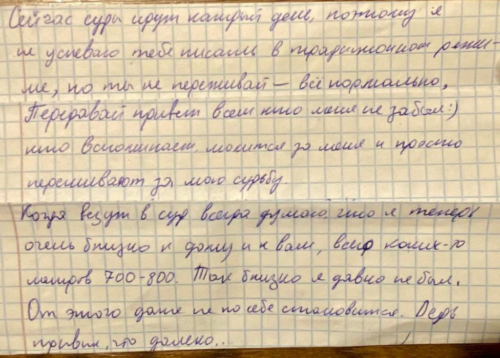 «…Сейчас суды идут каждый день, поэтому не успеваю писать в традиционном режиме, но ты не переживай – всё нормально.