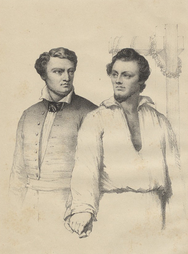 Паўстанцы Міхал Валовіч і Артур Завіша каля шыбеніцы, гравюра М. Ходзькі