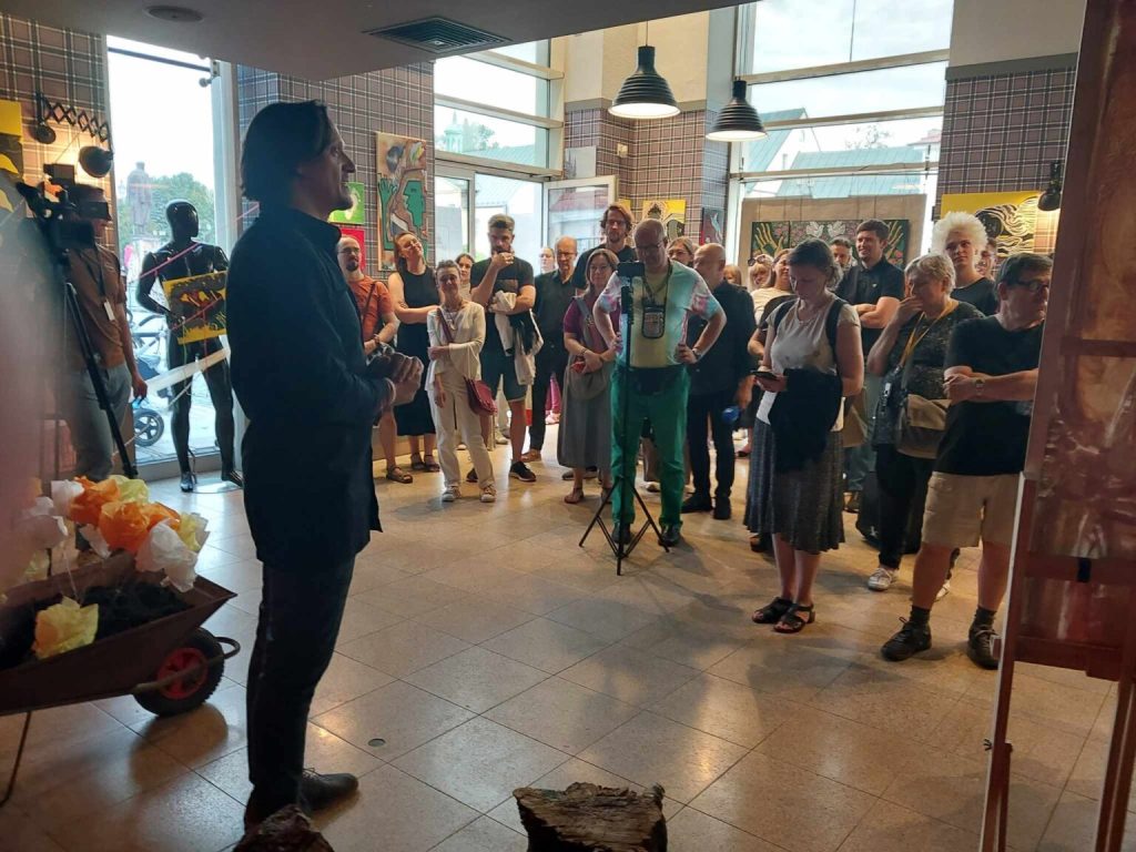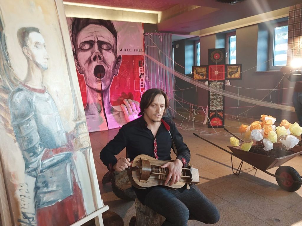 – У нас стварыўся яшчэ адзін “Дом творцаў” – у Беластоку, дзе 14 дзён працавала 14 мастакоў. І гэта стала вынікам – тое, што вы бачыце… Я спяваў сваю песню і ў гэты час думаў пра Алеся. Тэмай нашай выставы стала… не хацелася, каб гэта была тэма… але… мы вырашылі прысвяціць гэтую выставу Алесю Пушкіну.