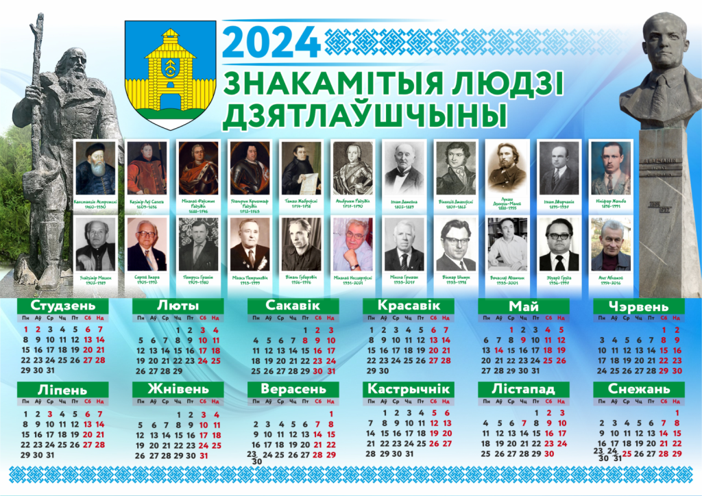 Краязнаўцы Дзятлаўшчыны падрыхтавалі і выпусцілі прыгожы насценны каляндар на 2024 год “Знакамітыя людзі Дзятлаўшчыны”. Раней аналагічны каляндар выдалі краязнаўцы Шчучыншчыны.