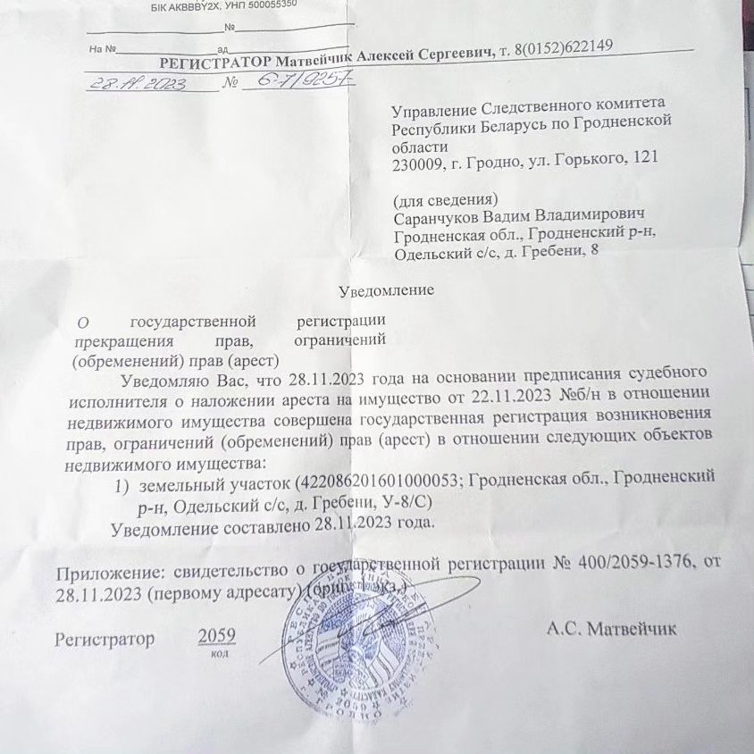 Улады працягваюць пераследаваць гарадзенскіх грамадска-палітычных лідараў. Адзін з кіраўнікоў Партыі БНФ Вадзім Саранчукоў паведаміў у сацсетках, што ўлады наклалі арышт на яго лецішча ў вёсцы Грабяні Гарадзенскага раёну. На адрас Саранчукова, які зараз не пражывае ў Беларусі, прыйшоў афіцыйны ліст з Упраўлення Следчага камітэту з адпаведным паведамленнем.