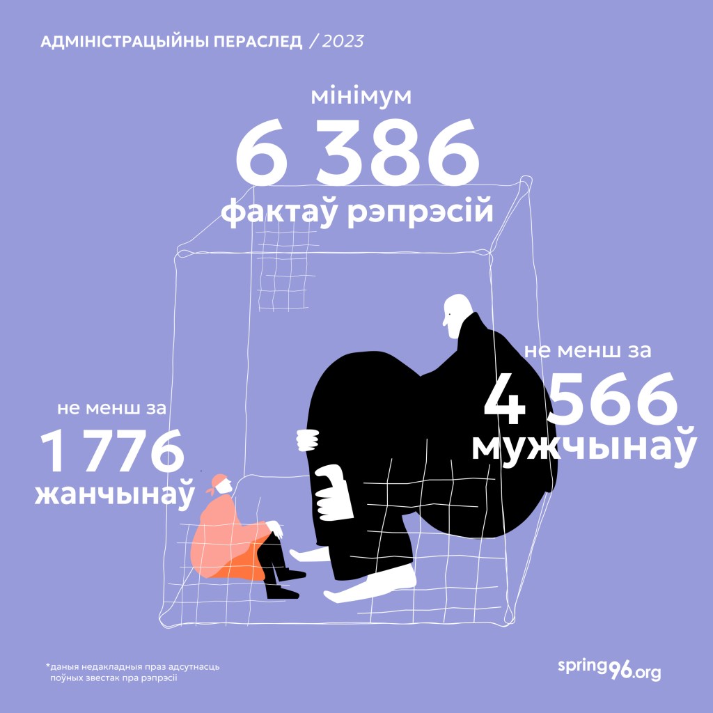 Па інфармацыі Праваабарончага цэнтру “Вясна”, у мінулым годзе сутыкнуліся з рознымі відамі рэпрэсій мінімум 6 386 чалавек. З іх 1 776 — жанчыны, а 4 566 — мужчыны.