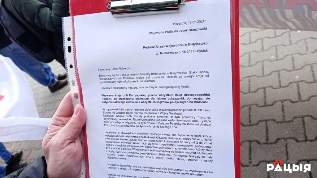 Ля Управы Падляшскага ваяводства 19 лютага адбылася акцыя, накіраваная на тое, каб чарговы раз прыцягнуць увагу польскіх уладаў да вострай праблемы палітвязняў у Беларусі і прапанаваць ім разгледзець магчымасць ультыматуму рэжыму Лукашэнкі.