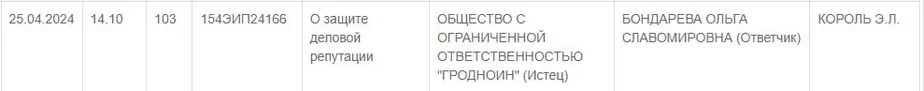 Пасяджэнне «аб абароне дзелавой рэпутацыі» запланавана ў Эканамічным судзе Гарадзенскай вобласці на 25 красавіка. Суддзя — Эдуард Кароль, заўважыў канал «Право имеют».