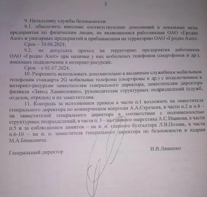Асабістымі смартфонамі дазволяць карыстацца толькі намеснікам гендырэктара “Гродна Азота” і “Завода Хімвалакно”, кіраўнікам структурных падраздзяленняў ды іх намеснікаў. У спісе дазволаў не пазначаны гендырэктар, але, верагодна, ён пад забарону таксама не трапіць.