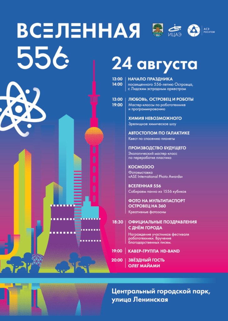 на “АтомДвижы” будуць забавы для дзяцей, хімічнае шоў. Праздник организован под эгидой «Вселенная №556» – это то, как Островец примерно будет выглядеть «100 лет тому вперёд». Не абыдзецца і без выставы ваеннай тэхнікі.