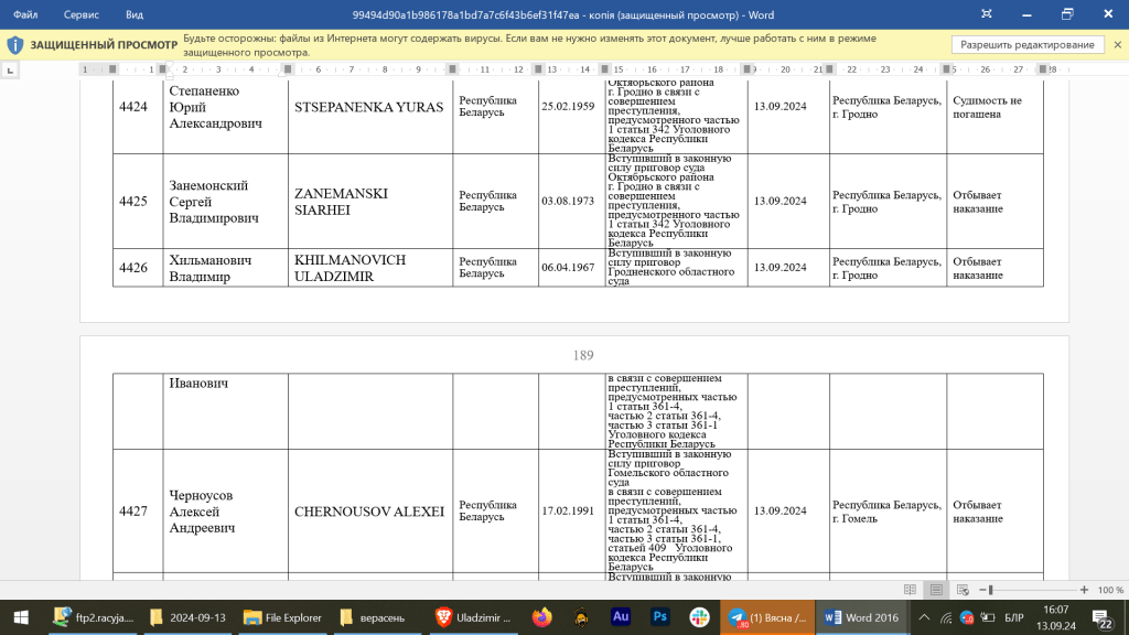 13 верасня МУС зрабіла традыцыйны пятнічны апдэйт «Пераліка грамадзян Беларусі, замежных грамадзян або асоб без грамадзянства, якія маюць дачыненне да экстрэмісцкай дзейнасці».