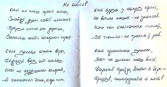 Палітзняволены аўтар «Новага Часу» Дзяніс Івашын напачатку студзеня даслаў бацькам верш. Пра гэта паведаміла жонка журналіста Вольга Івашына. «Назоў гэтага вершу ў той ці іншай форме ўжываецца ў Бібліі 365 разоў (на кожны дзень году), імаверна, каб дакладна дайшло да чытачоў. І наш ваяр раіць тое самае ў сваім новым лірычна-філязоўскім творы», — напісала яна.