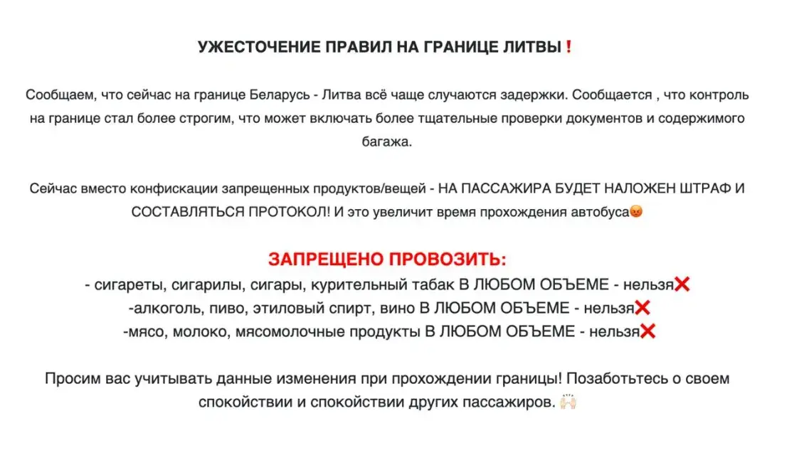 Перавозчыкі нагадваюць, што ўвогуле нельга праводзіць цыгарэты (нават адну штуку), алкаголь, мясныя ці малочныя прадукты.