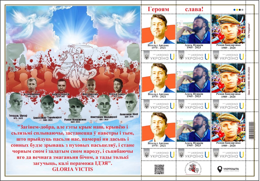 У беларускай эмігранцкай філатэліі адбылося чарговае выданне «Героям слава!». Маркавы лісток, прысвечаны забітым і закатаваным за ўдзел у Рэвалюцыі годнасці 2020, выдадзены поштай Украіны праз паслугу «Власна поштова марка».