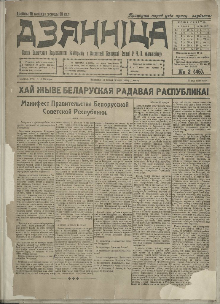 “Дзянніца” – беларуская газета, заснаваная Змітром Жылуновічам у Петраградзе ў 1916 г. Адноўленая ў 1918 г., яна стала першай савецкай газетай на беларускай мове. Крыніца: commons.wikimedia.org