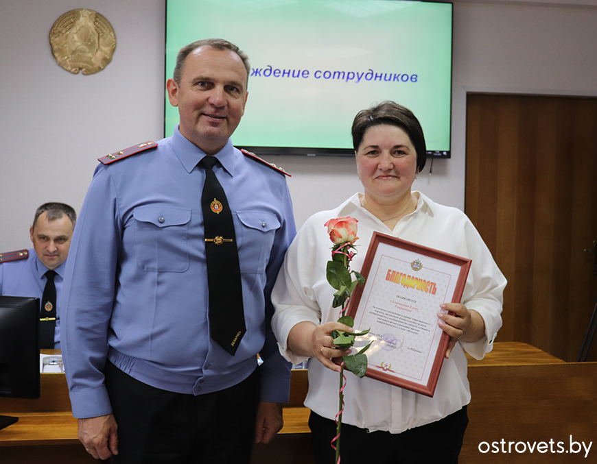 Таксама шэрагу міліцыянтаў прысвоены новы чын капітана. А “за тесное сотрудничество, взаимопомощь и вклад в развитие и воспитание участников военно-патриотического клуба «Фемида» СШ №2 Благодарностью начальника РОВД и денежным вознаграждением отмечена заместитель директора этой школы Елена Сильванович“. Выяўляецца, што міліцыянты могуць узнагароджваць педагогаў ня толькі папяровымі граматамі, але і грашыма.