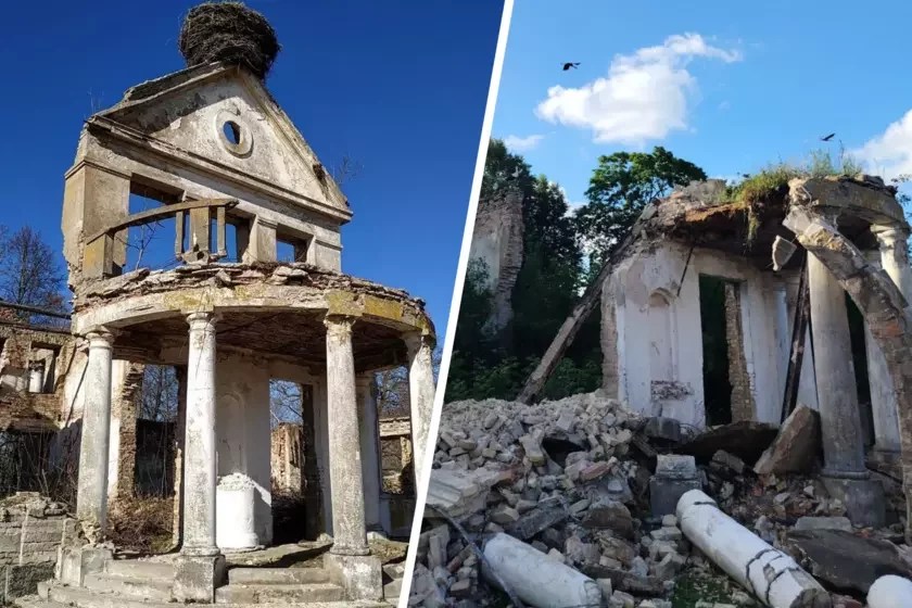 Сёння сцяна на вытрымала і абвалілася, разбурыўшы таксама большую частку калоннага порціка.