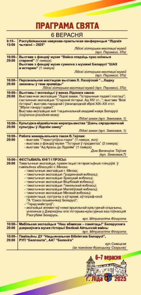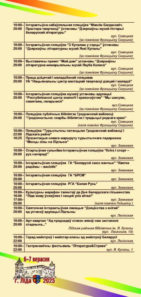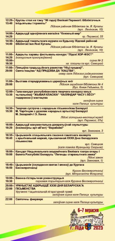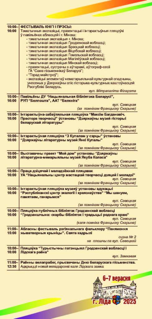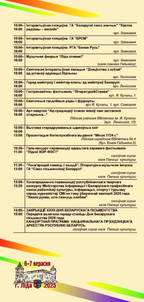 Ключавыя падзеі — афіцыйнае адкрыццё свята, узнагароджанне лаўрэатаў Нацыянальнай літаратурнай прэміі і «Лідскія чытанні» — адбудуцца 6 верасня.