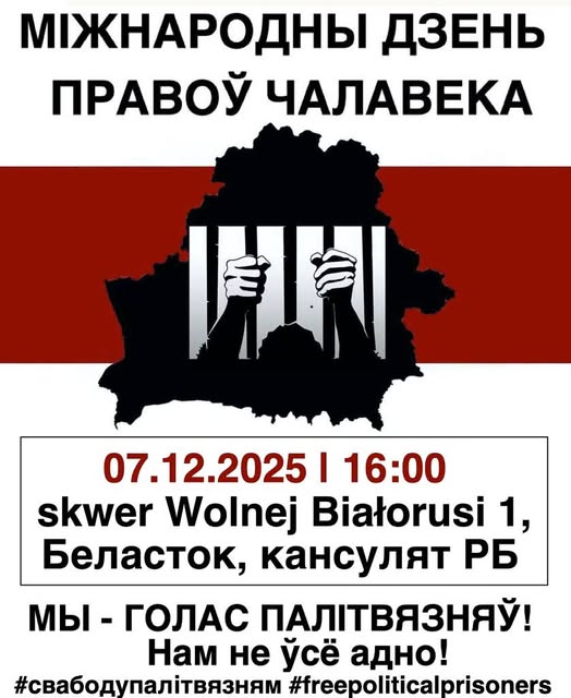 Да Міжнароднага дня правоў чалавека, які адзначаецца 10 снежня, беларусы Беластока выйдуць, каб нагадаць, што ў Беларусі працягваюцца рэпрэсіі, катаванні, не дзейнічаюць законы. Акцыя салідарнасці пройдзе ў Скверы Вольнай Беларусі 7 снежня а 16.00.