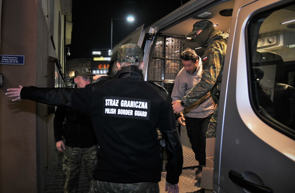 Прадстаўнікі памежнай службы Польшчы і замежнік, якога дэпартуюць. Фота: strazgraniczna.pl