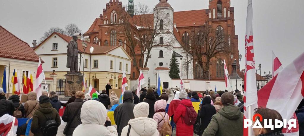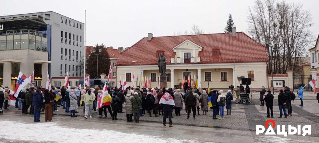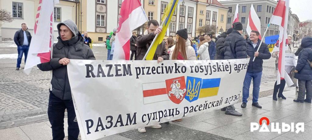 У цэнтры Беластока, насупраць помніка Юзэфу Пілсудскаму, прайшла акцыя беларускай дыяспары «Разам супраць расейскай агрэсіі» на знак салідарнасці з Украінай да чацвёртых угодкаў поўнамаштабнай вайны.